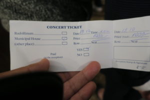 さて、これで散策を終了し宿に戻りコンサートの時間になるまで休憩してから、少し早めに夜景を見ながらMunicipal House(市民会館:スメタナホール)に向かい到着。というのも、席ははやいものがちだしチケットも手書きなので少し不安だったので(笑)