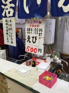 朝市に到着しました。早速以下を食しに何軒か聞いて回りますが、今年はイカ少ないみたいです(釣り堀もスルメイカだったと思う)。。。
