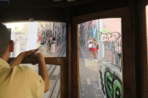 リスボンに戻ってきたので、1日券を買っていることもあり乗れる路面電車に乗ろうと市内へ。でも、宿近くの斜面電車が気になっていたので乗れるようだったら乗ろうと向かってみると1日券使えたので頂上まで向かいます。途中カメラを電車に向けているのでなんか写真撮れてる気分になるなと思いながら終点に。終点地点のMiradouro de Santa Catarina(サンタ・カタリーナ展望台)でもみんな写真を撮っていました。