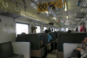 釧路湿原駅に到着し、電車が来ました。ここから3時間の各駅停車の移動になります。