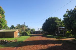 赤土の道、向こうに緑の畑、その上には青い空といったのどかな景色を見ながら民宿小林に到着
