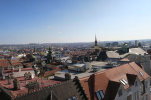 塔の頂上についてしばらく外でれないんだと塔の中から外を見ていると後から登ってきた人が扉を開けて外に・・・ここから出れたんだと私も出て周りを一周。ブルノの街がちゃんと一望できるポイントでした。ちなみに、ここからちょっと意外な光景も見れる感じなんですね。