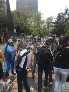カーニバルをやっているPlaza Antonio José de Sucre(学生広場)に歩いて移動します。カーニバル楽しそうです。7月16日通りは車両通行止めになっているので、サンフランシスコ寺院までゆっくり歩いていきます。中身的にはすれ違いざまに泡をかけあっています。すれ違いざまにかけられたらかけ返すといった感じでやっていましたので観光客にはあまりかからない。。。はずですが私は誤爆しました。一人じゃなかったら、絶対に泡の缶を買って私も参加しただろうなと思うくらい楽しそうでした。(ただ、携帯とか心配ですね)